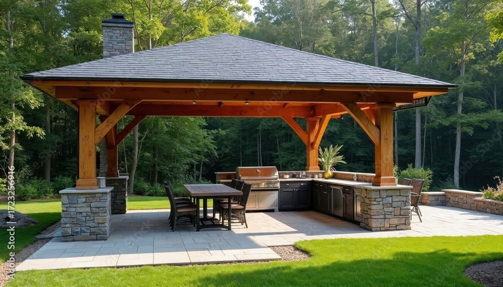- Cuisine extérieure sans couverture : un abri de cuisine extérieure vous permet de cuisiner et de recevoir en plein air, à l'abri du soleil et de la pluie, avec un design qui s'intègre harmonieusement à votre aménagement paysager.